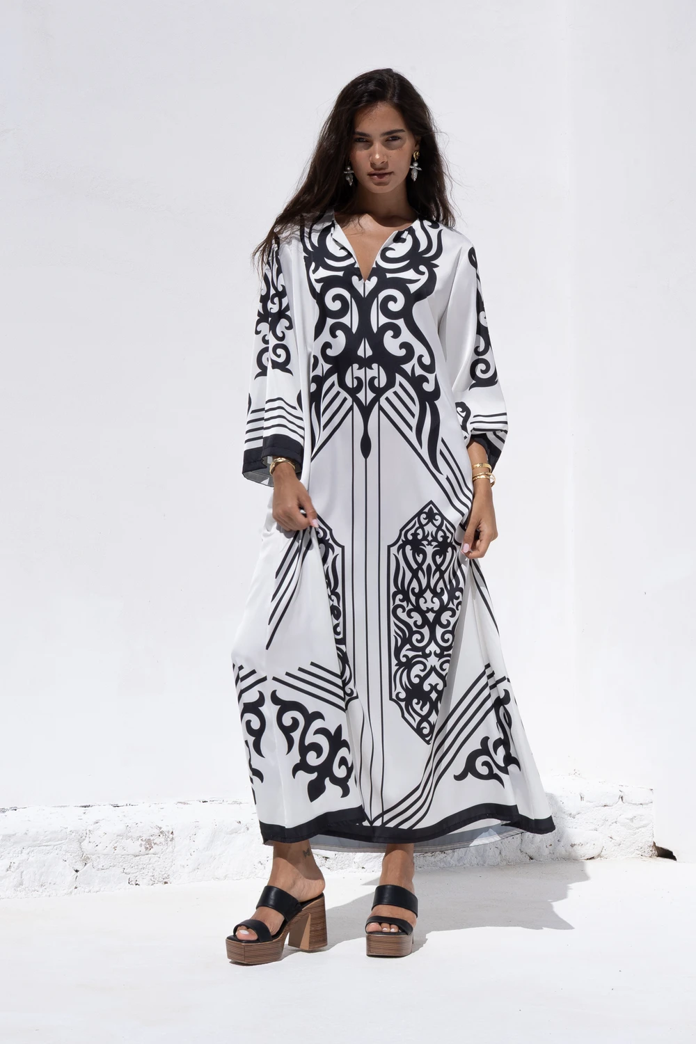Εντυπωσιακό maxi kaftan σε λευκό με τολμηρό μαύρο baroque print από στρόβιλους και αραβουργήματα — η απόλυτη δήλωση στυλ που κλέβει τις εντυπώσεις σε κάθε summer setting.