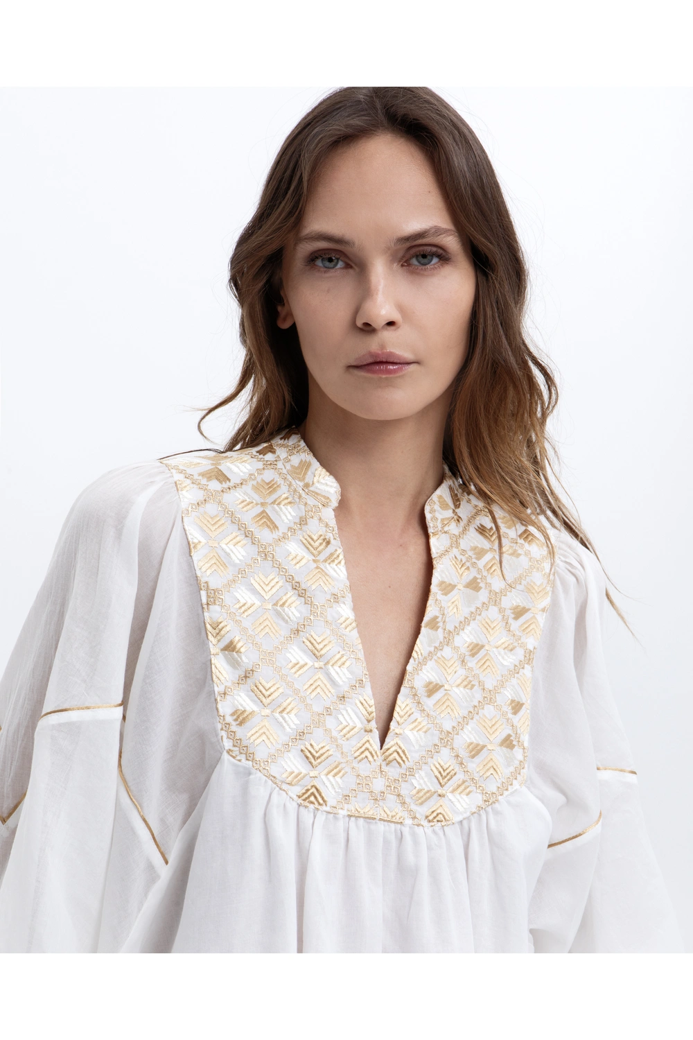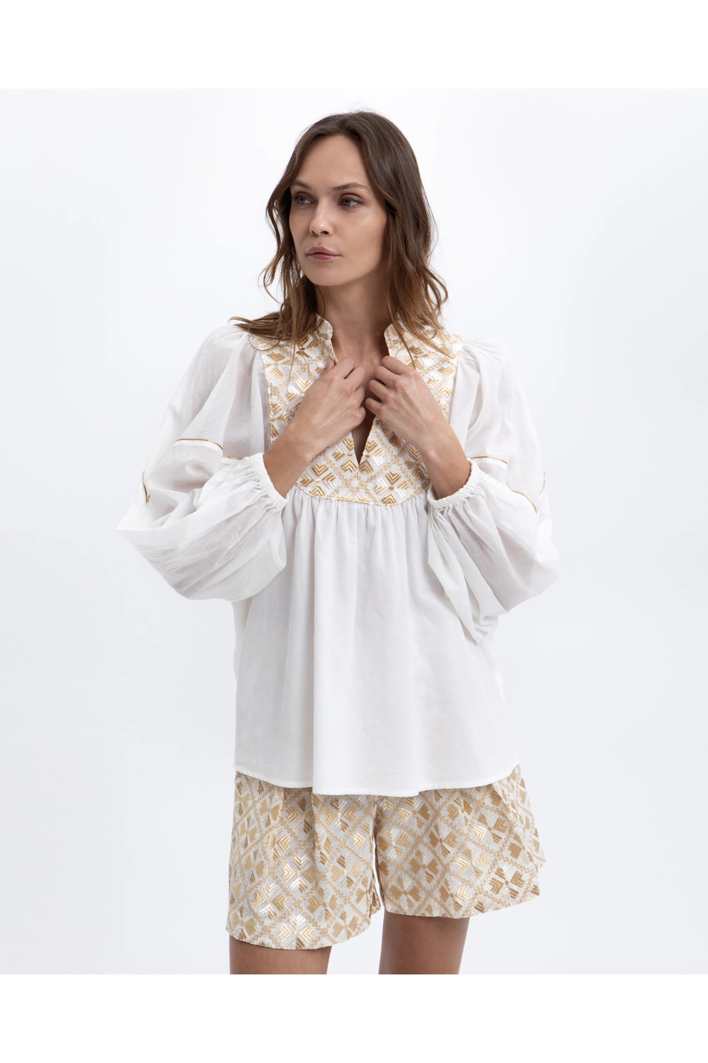 Μια ρομαντική λευκή linen μπλούζα με φουσκωτά μανίκια που συνδυάζει folk εμπνευση με μεσογειακή αίσθηση ελευθερίας. Το γεωμετρικό χρυσό jacquard bib στο μπούστο λειτουργεί ως κόσμημα από μόνο του, δίνοντας βάρος και χαρακτήρα στην αέρινη λευκή γραμμή. Ένα κομμάτι που μεταφέρει την απλότητα σε κάτι βαθύτερα εκλεπτυσμένο.