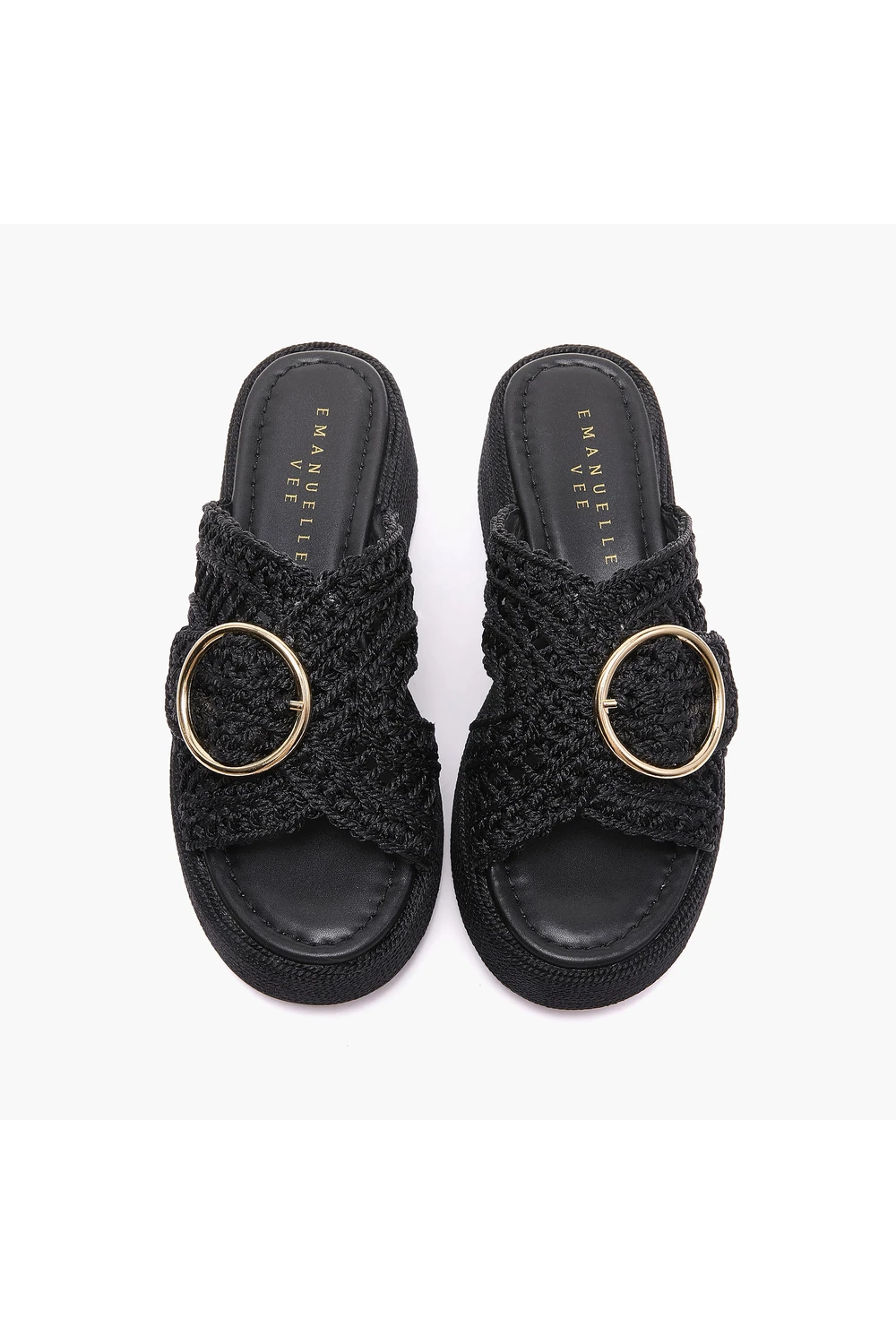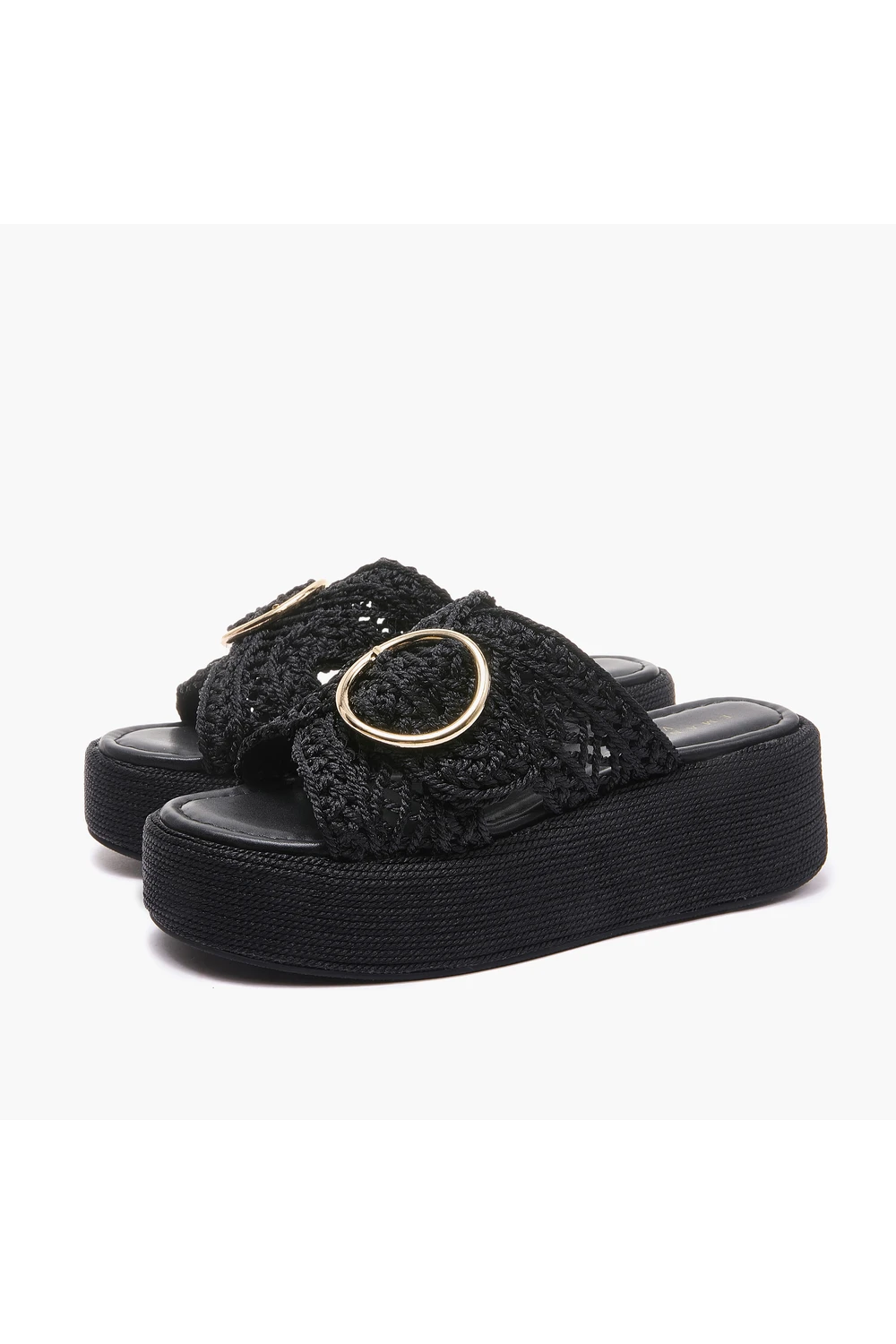 Platform mules από μαύρο crochet ύφασμα με χρυσή στρογγυλή πόρπη — η τέλεια ισορροπία ανάμεσα στο boho αισθητικό και την αστικής κομψότητα.