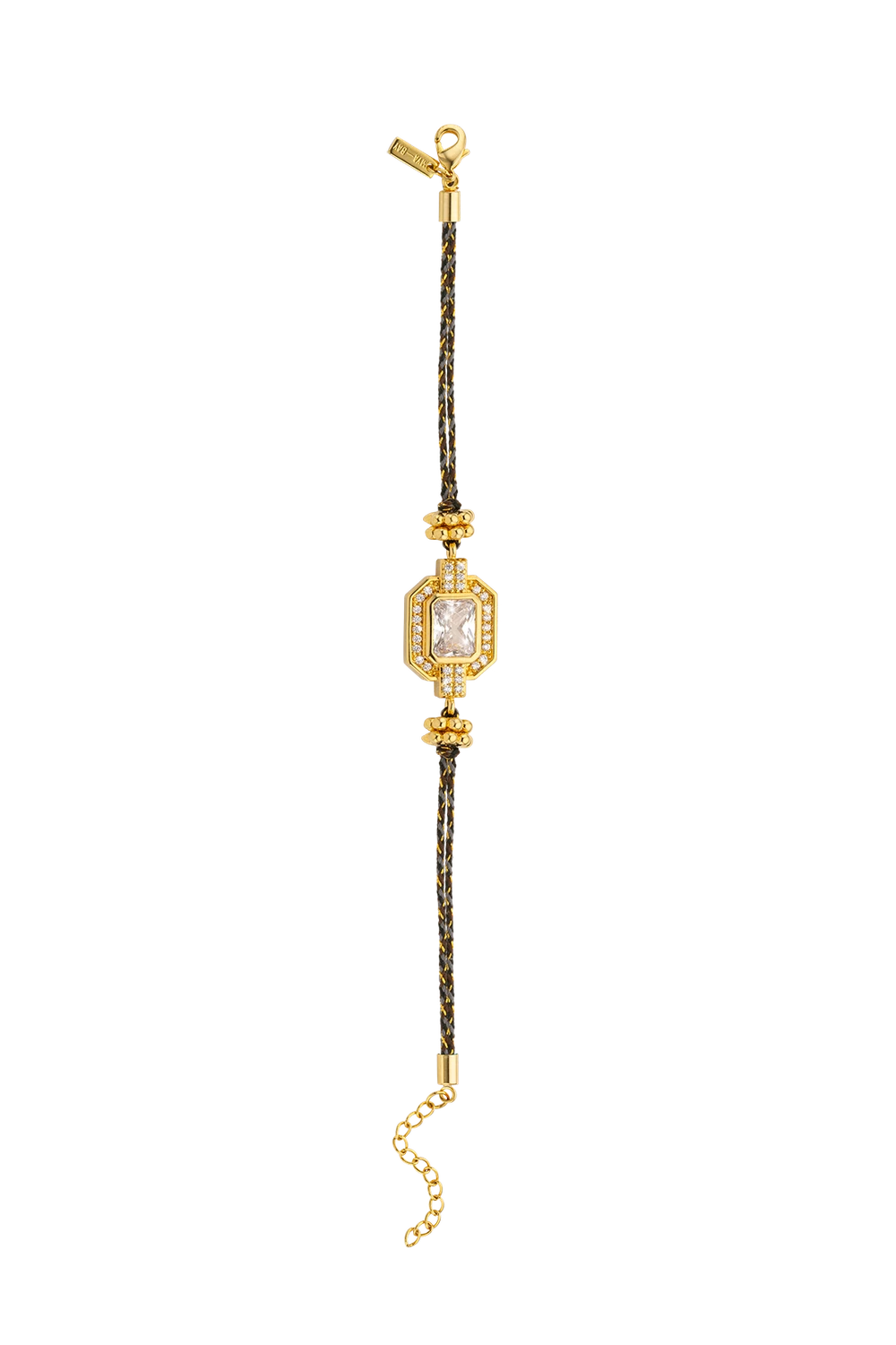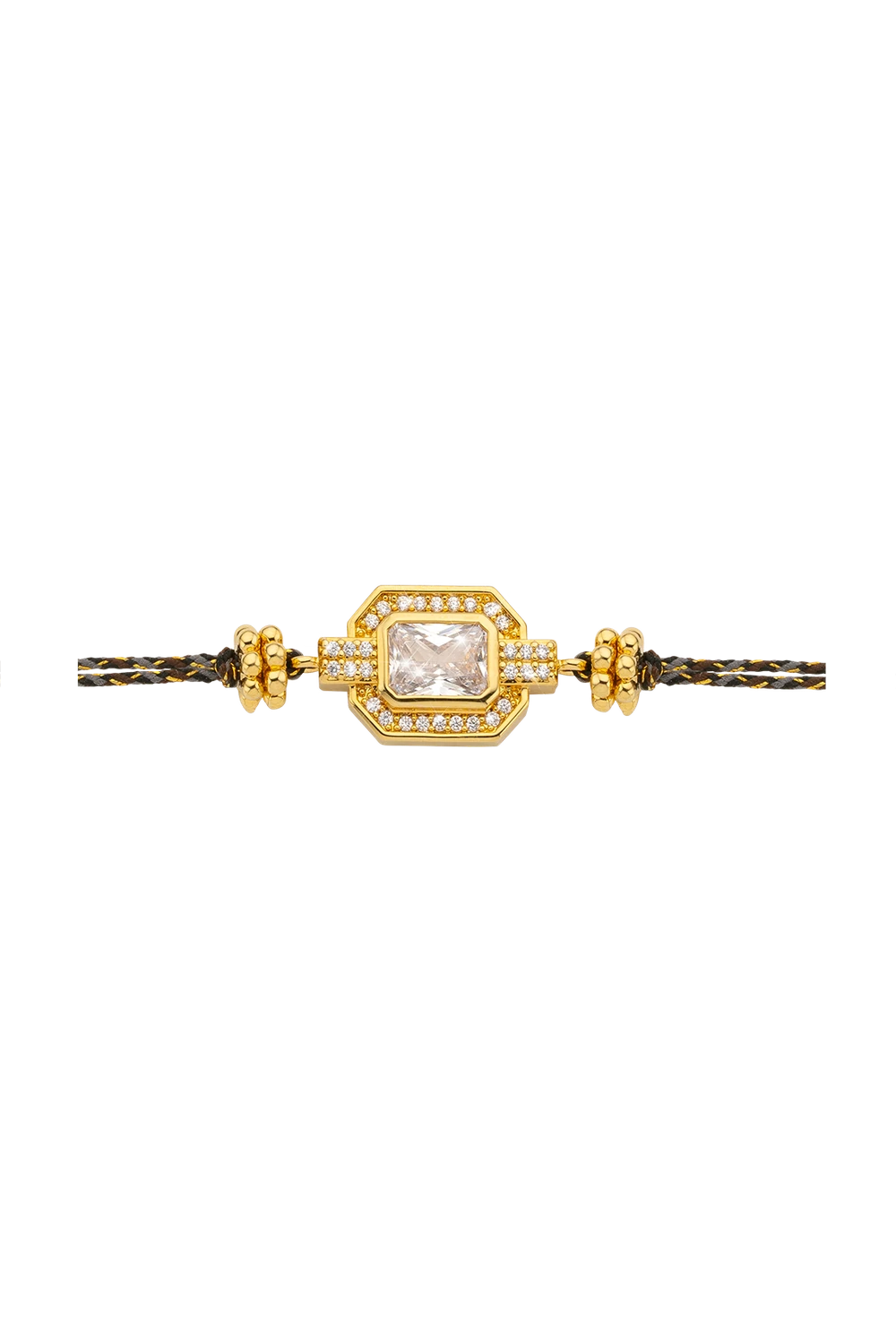 Βραχιόλι με οκτάγωνο χρυσό στοιχείο και εντυπωσιακό λευκό ζιργκόν emerald cut σε halo από μικρά ζιργκόν, με χρυσά στοιχεία εκατέρωθεν στο κορδόνι. Σε πλεκτό κορδόνι μαύρου και χρυσού — καθαρό, λαμπερό, αναλλοίωτο.