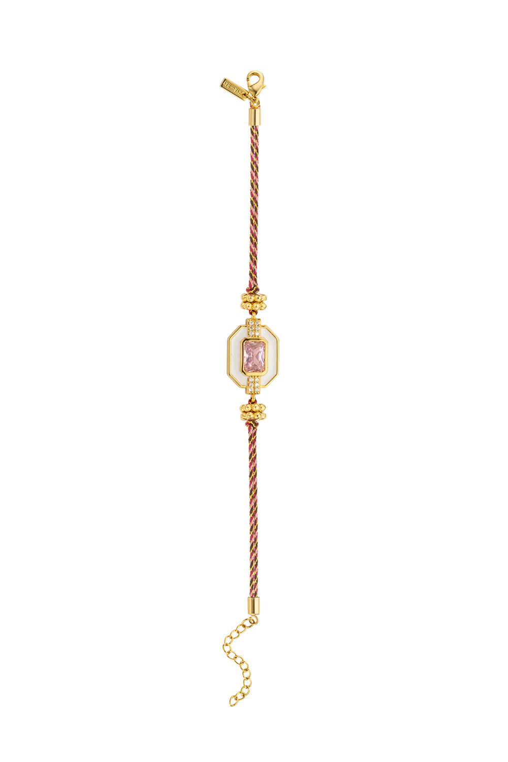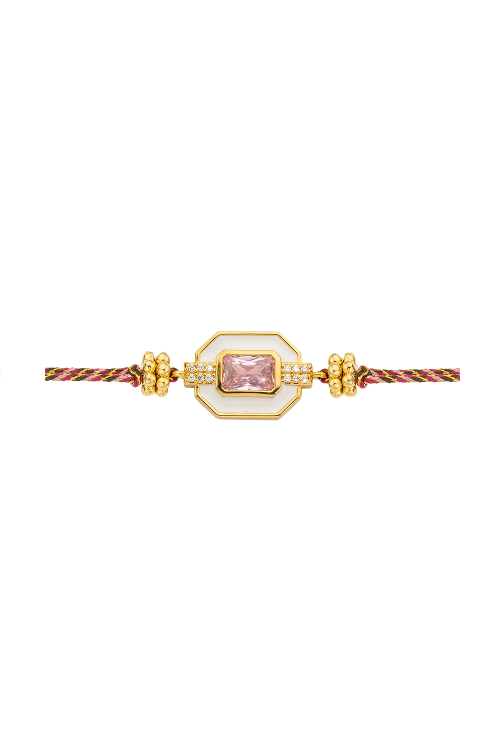 Βραχιόλι με οκτάγωνο στοιχείο από λευκό σμάλτο και κεντρικό ροζ ζιργκόν emerald cut, με μικρά λευκά ζιργκόν εκατέρωθεν και χρυσά στοιχεία στο κορδόνι. Σε πλεκτό κορδόνι ροζ, μπορντό και χρυσού — απαλό, κομψό και αθόρυβα θηλυκό.