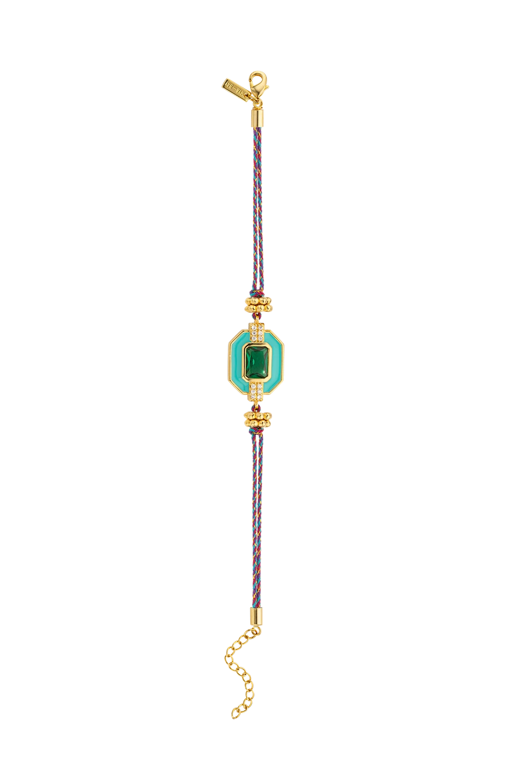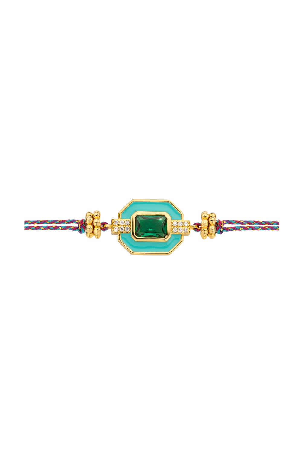 Βραχιόλι με οκτάγωνο στοιχείο από τιρκουάζ σμάλτο και βαθύ πράσινο ζιργκόν emerald cut, με λευκά ζιργκόν εκατέρωθεν και χρυσά στοιχεία στο κορδόνι. Σε πολύχρωμο πλεκτό κορδόνι — φρέσκο, καλοκαιρινό και αδιόρατα εκλεπτυσμένο.