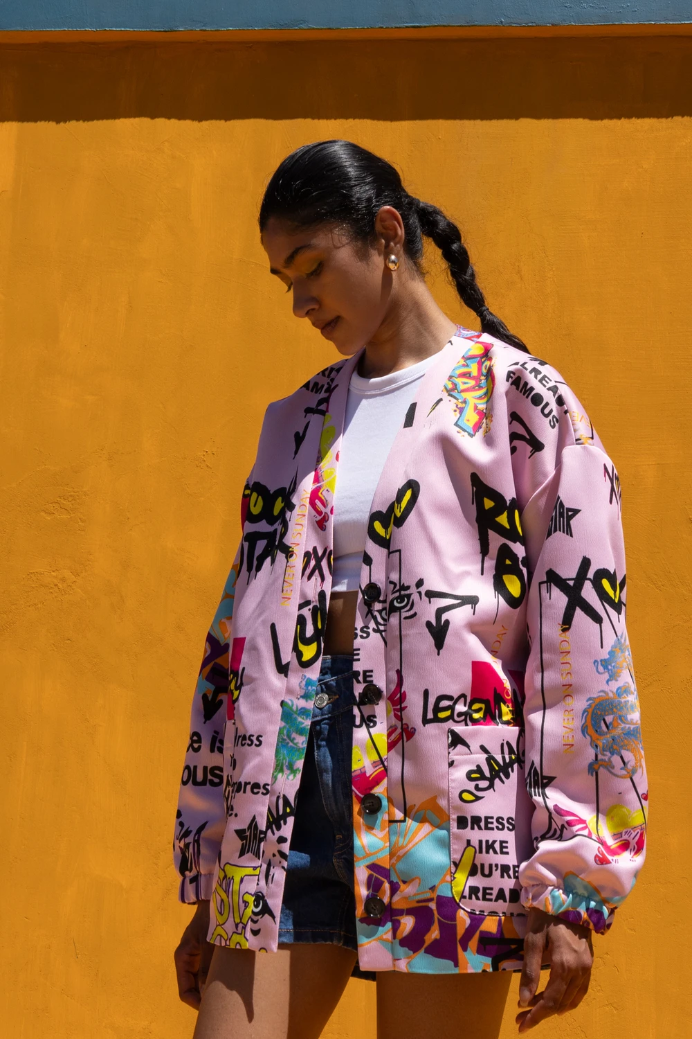 Φορέστε το με basic T-shirt και denim shorts ή τζιν για casual street-style look, ή συνδυάστε το με μονόχρωμο φόρεμα ώστε το jacket να πρωταγωνιστεί. Ολοκληρώστε με sneakers ή chunky σανδάλια για μοντέρνο αποτέλεσμα.