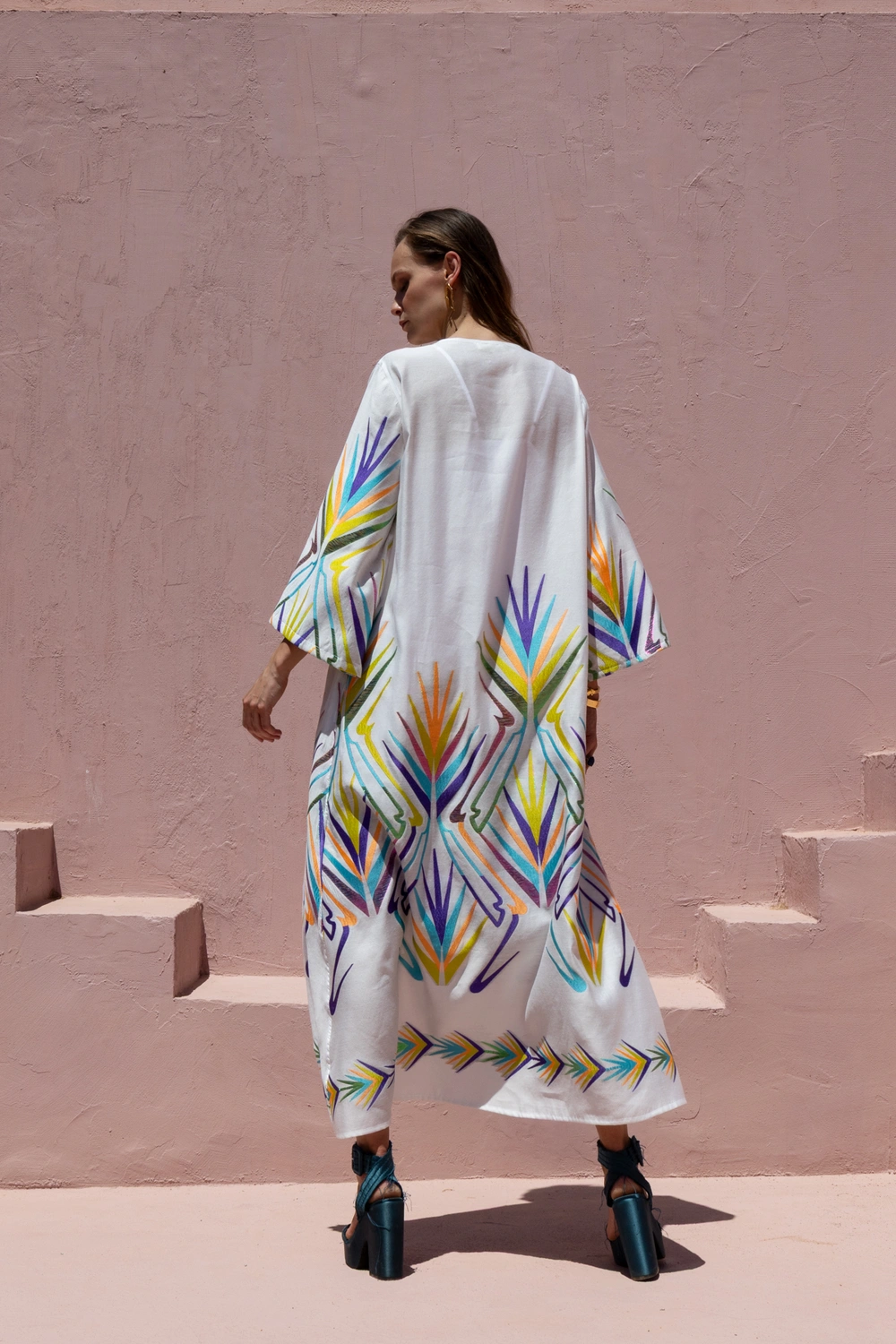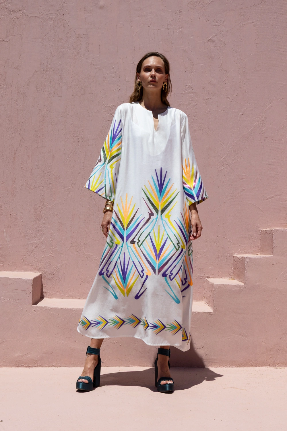 Αυτό το εντυπωσιακό λευκό καφτάνι συνδυάζει την απόλυτη άνεση με την καλλιτεχνική αισθητική, χάρη στα έντονα πολύχρωμα γεωμετρικά μοτίβα που θυμίζουν φύλλα φοίνικα. Διαθέτει κομψή λαιμόκοψη V, φαρδιά μανίκια και αέρινη γραμμή, προσφέροντας ένα statement look για τις καλοκαιρινές σας εμφανίσεις. Κατασκευασμένο από δροσερό ύφασμα υψηλής ποιότητας, είναι η ιδανική επιλογή για να ξεχωρίσετε από το πρωί έως το βράδυ.
