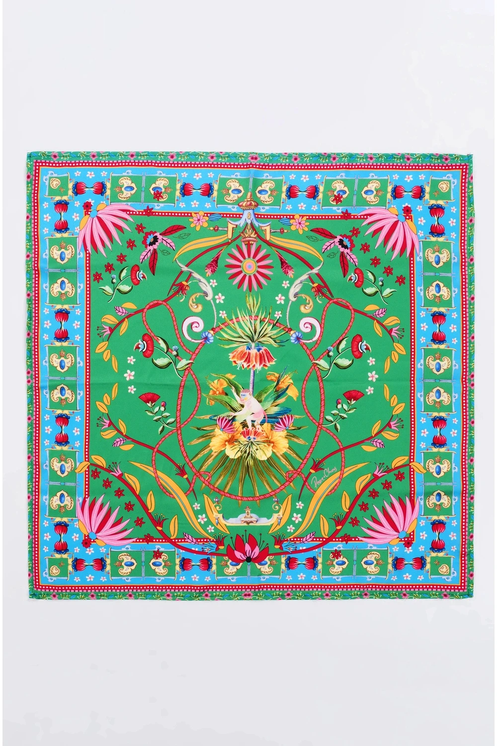 Το Exotic Scarf είναι ένα τετράγωνο σατέν φουλάρι με έντονα χρώματα και σχέδια πάνω σε πράσινη βάση. Μπορεί να φορεθεί ως statement αξεσουάρ ή να συνδυαστεί με τα υπόλοιπα Exotic pieces με το ίδιο print.