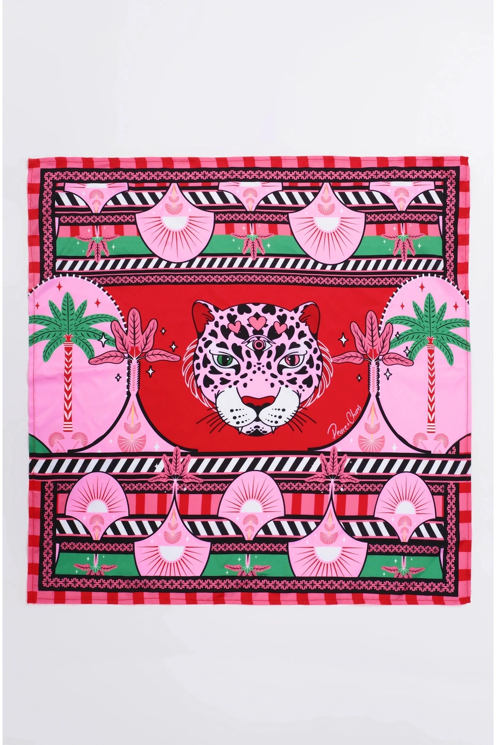 Το Fantasia Scarf είναι ένα τετράγωνο σατέν φουλάρι σε έντονο ροζ και κόκκινο χρώμα, με πράσινες πινελιές. Το σχέδιό του έχει φοίνικες και διάφορα διακοσμητικά μοτίβα. Μπορεί να φορεθεί με τα υπόλοιπα Fantasia κομμάτια με το ίδιο print ή να προστεθεί στο ντύσιμό σας για να δώσει χρώμα.