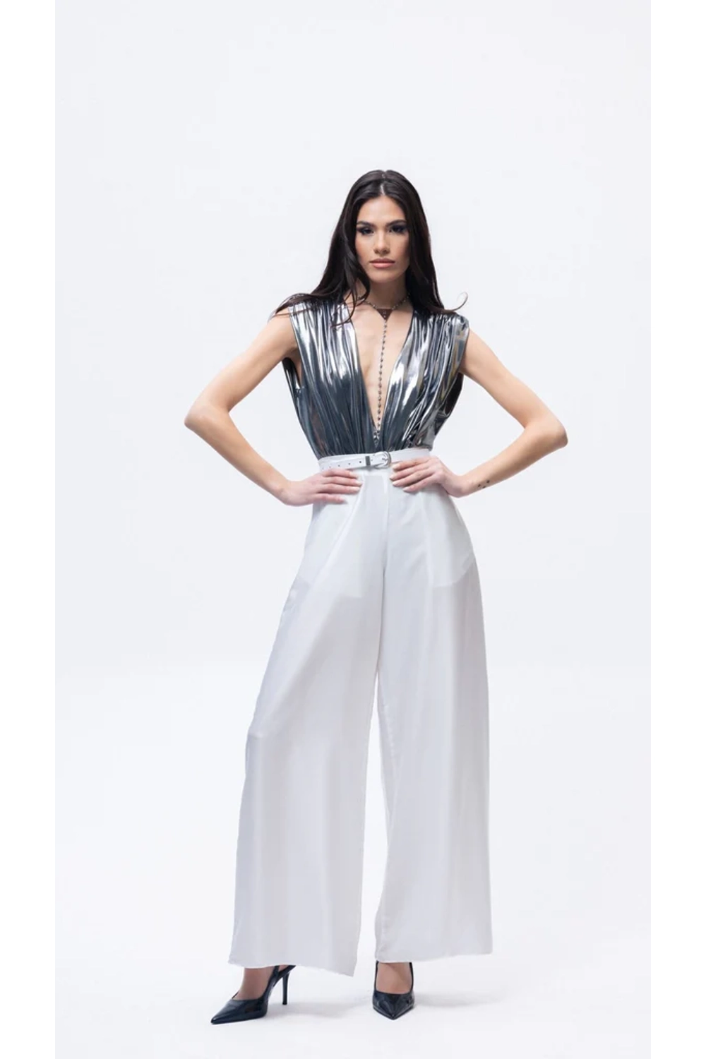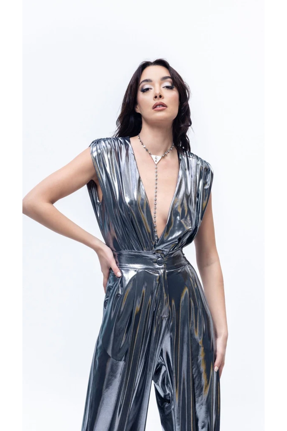 Κορμάκι με γυαλιστερή foil υφή, που αναβαθμίζεται με ένα αφαιρούμενο κολιέ από ανοξείδωτο ατσάλι, αποπνέοντας μια τολμηρή, φουτουριστική αισθητική.