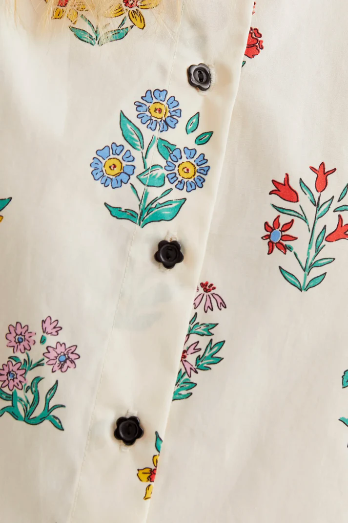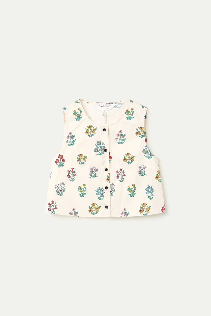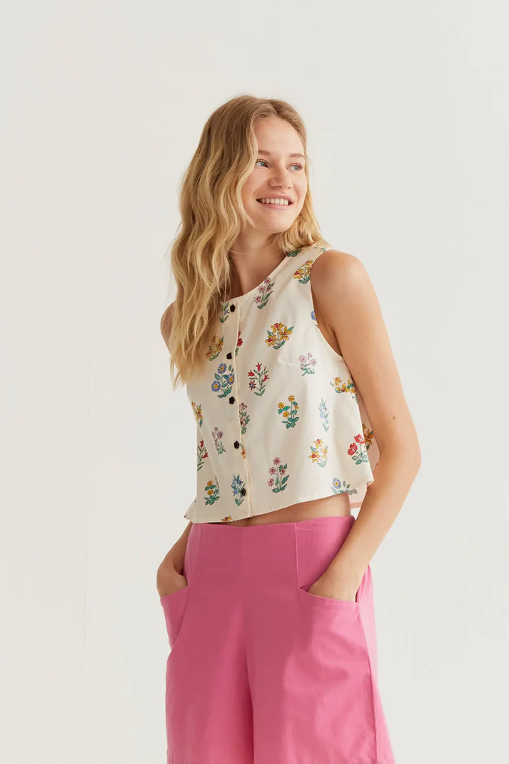 Τοπ από 100% βαμβάκι με σχέδιο gardener. Στρογγυλή λαιμόκοψη και αμάνικο σχέδιο. Κλείσιμο μπροστά με διακοσμητικά κουμπιά σε σχήμα λουλουδιού. Το μοντέλο έχει ύψος 177 cm και φοράει μέγεθος S.