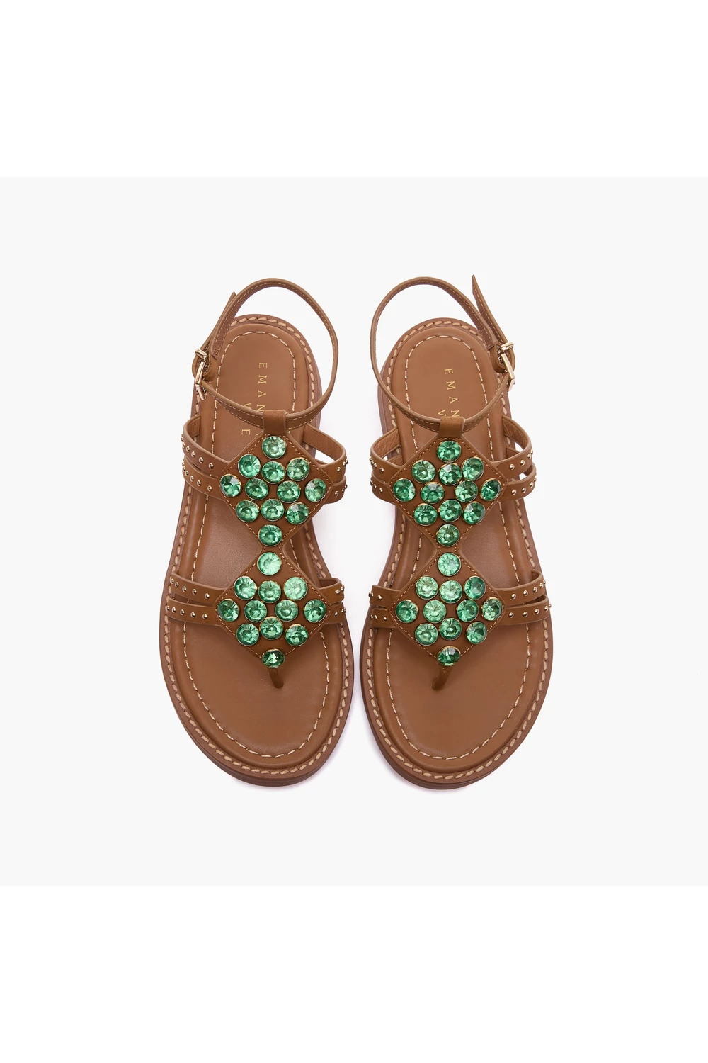 Δερμάτινο gladiator πέδιλο σε ταμπά με σμαραγδένια κρύσταλλα, χρυσά καρφάκια και λουράκι αστραγάλου — η αρχαιοελληνική αισθητική ανανεωμένη για τη σύγχρονη γυναίκα.