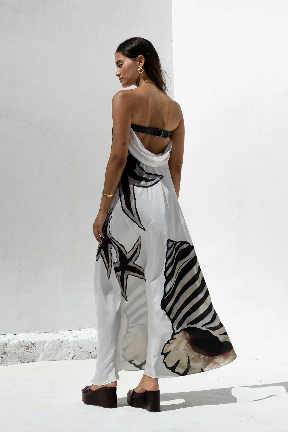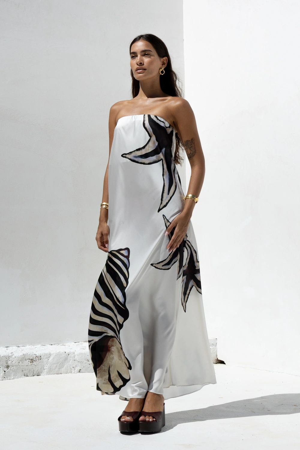 Αναδείξτε τη θηλυκότητά σας με αυτό το εντυπωσιακό maxi φόρεμα σε στράπλες γραμμή. Ο minimal σχεδιασμός του συνδυάζεται αρμονικά με το καλλιτεχνικό, oversized print, δημιουργώντας ένα κομψό και μοντέρνο αποτέλεσμα. Η ανάλαφρη υφή του υφάσματος χαρίζει μοναδική αίσθηση κίνησης, ιδανική για καλοκαιρινές εμφανίσεις από το πρωί έως το βράδυ.