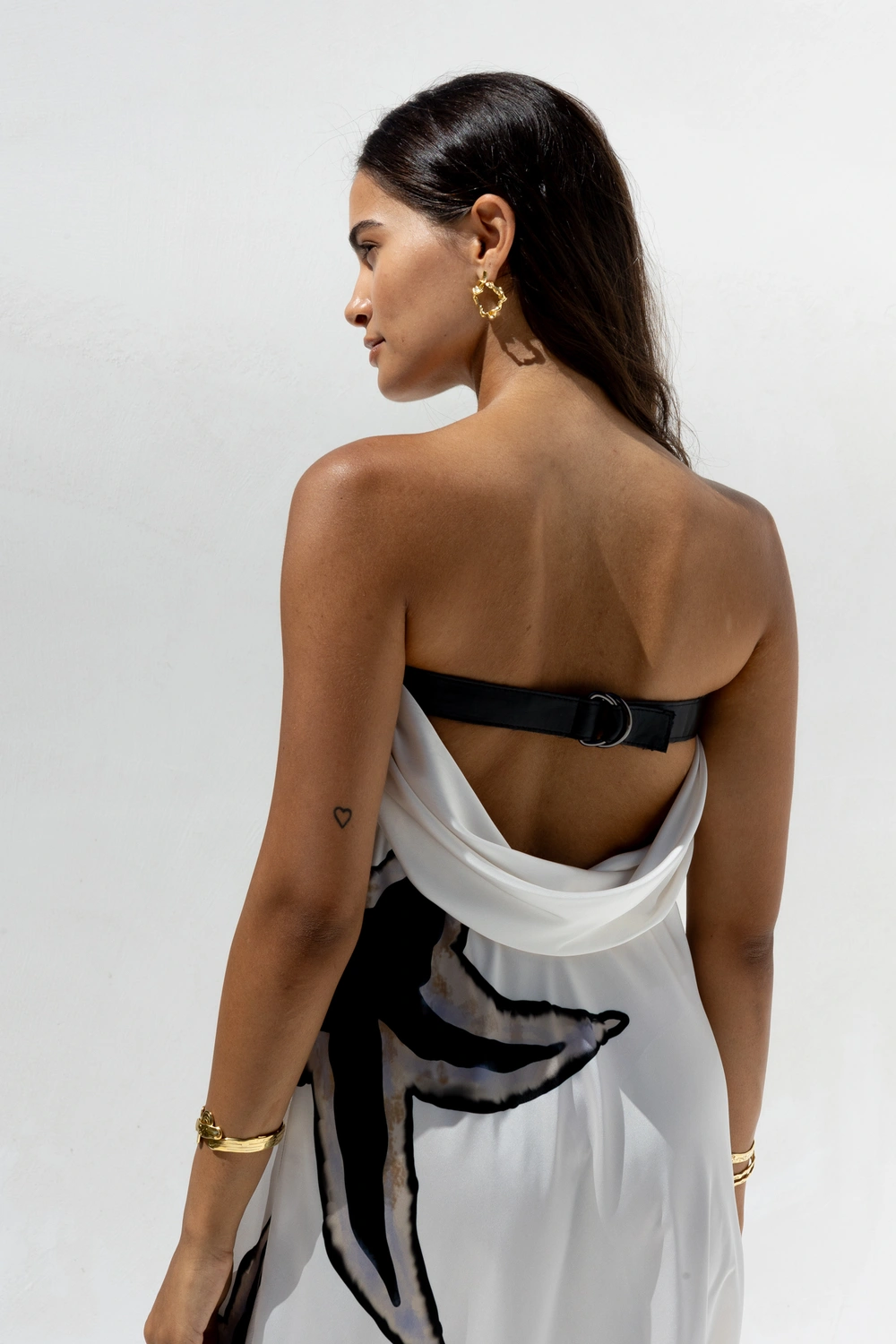 Η ίσια, ρευστή γραμμή του αγκαλιάζει το σώμα χωρίς να το περιορίζει, ενώ το strapless κόψιμο τονίζει διακριτικά τους ώμους και το ντεκολτέ.