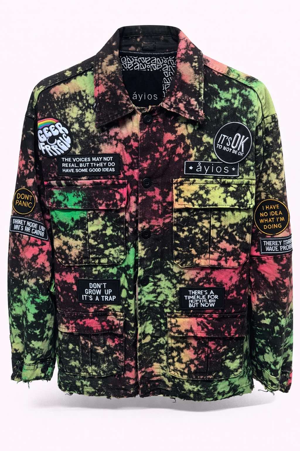 Ένα μοναδικό vintage στρατιωτικό τζάκετ, χειροποίητο στην Ελλάδα από την Ayios — το brand που συνδέει την τέχνη με τη μόδα. Κάθε κομμάτι είναι ξεχωριστό: acid-washed ύφασμα, αυθεντικά army patches, χειροποίητες γρατσουνιές και ένα εντυπωσιακό giant patch ζωγραφισμένο στο χέρι με κέντημα που δεν μοιάζει με κανένα άλλο. Εσωτερικά, φόδρα 100% βαμβάκι με το χαρακτηριστικό ayios pattern, γιακάς ultra high definition με το tagline του brand. Oversized γραμμή για all-genders, μανίκια που φοριούνται κανονικά ή διπλωμένα