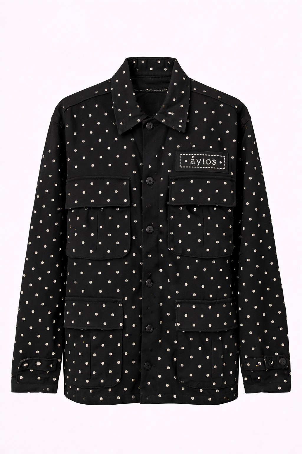 Ένα μοναδικό vintage στρατιωτικό τζάκετ, χειροποίητο στην Ελλάδα από την Ayios — το brand που συνδέει την τέχνη με τη μόδα. Κάθε κομμάτι είναι ξεχωριστό: acid-washed ύφασμα, αυθεντικά army patches, χειροποίητες γρατσουνιές και ένα εντυπωσιακό giant patch ζωγραφισμένο στο χέρι με κέντημα που δεν μοιάζει με κανένα άλλο. Εσωτερικά, φόδρα 100% βαμβάκι με το χαρακτηριστικό ayios pattern, γιακάς ultra high definition με το tagline του brand. Oversized γραμμή για all-genders, μανίκια που φοριούνται κανονικά ή διπλωμένα