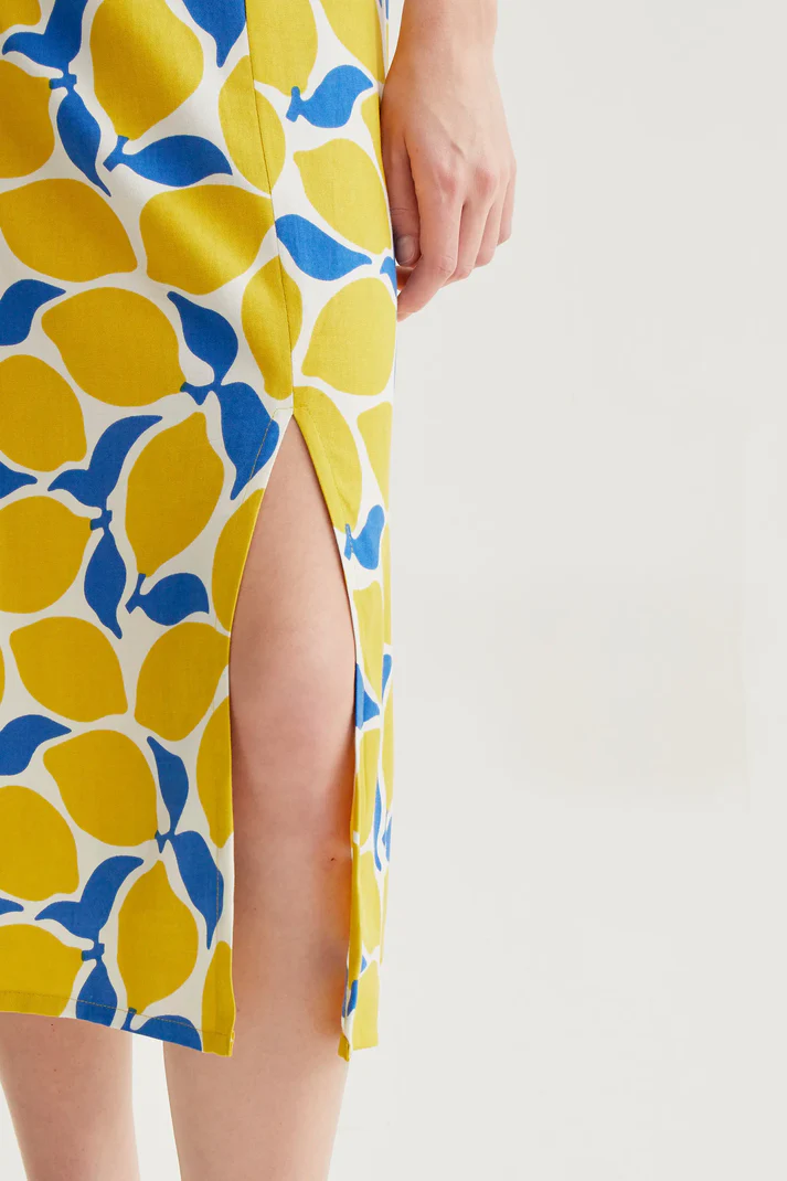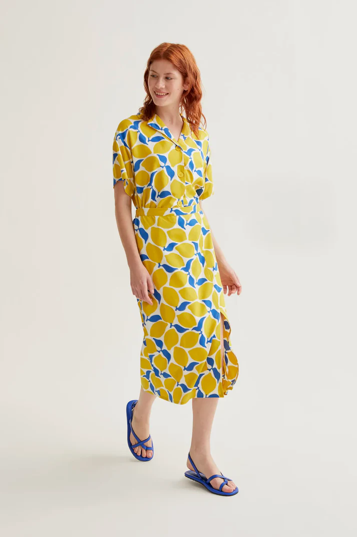 Midi φούστα με σχέδιο limoncello. Ψηλόμεση με σταθερή ελαστική μέση. Μικρό σκίσιμο στο πλάι. Το μοντέλο έχει ύψος 175 cm και φοράει μέγεθος S.