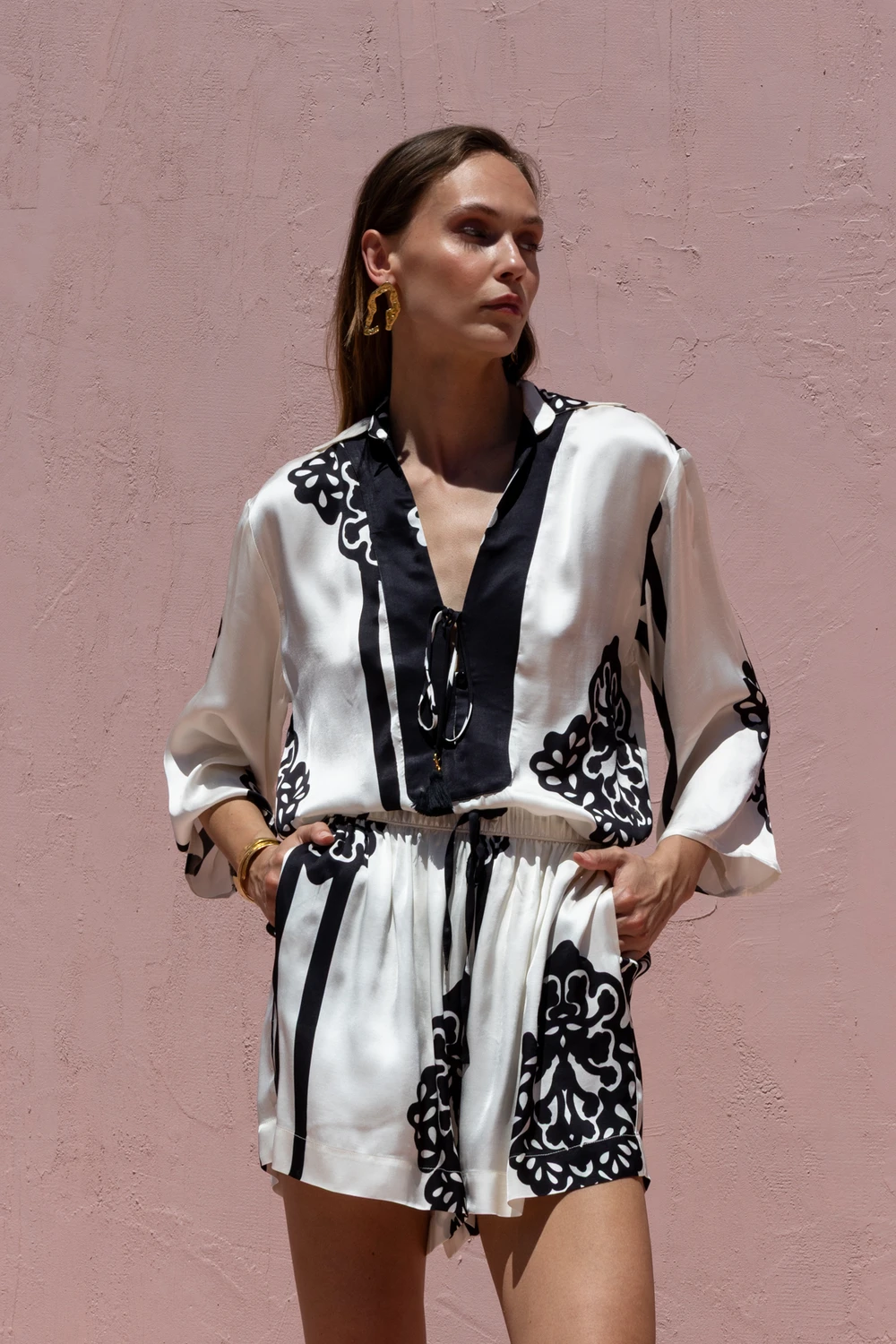 Κομψό καλοκαιρινό σορτς σε λευκό φόντο με εντυπωσιακό μαύρο floral print. Διαθέτει ελαστική μέση για άνετη εφαρμογή και chic bohemian αισθητική. Ιδανικό για beach look ή καλοκαιρινή έξοδο.