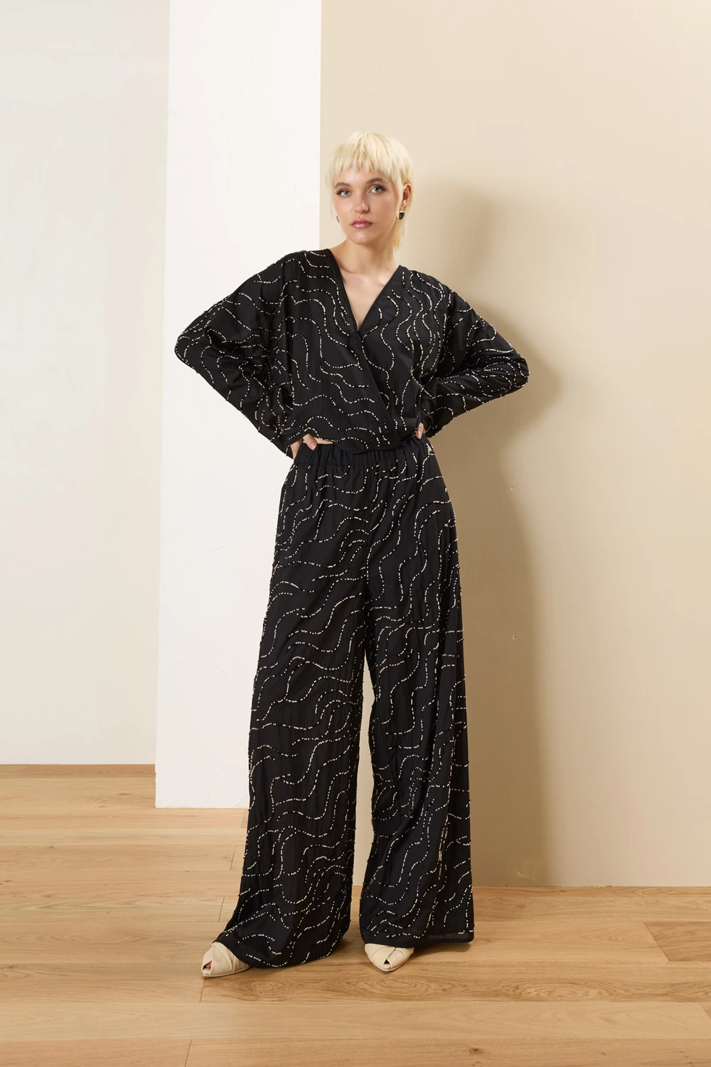 Αέρινο cropped top Souvenir σε βαθύ μαύρο τόνο με διακριτικό κυματιστό μοτίβο που χαρίζει μοντέρνα και καλλιτεχνική αισθητική. Η χαλαρή γραμμή και τα μακριά μανίκια δημιουργούν κομψή κίνηση, ενώ το V-ντεκολτέ προσθέτει θηλυκότητα και effortless sophistication.