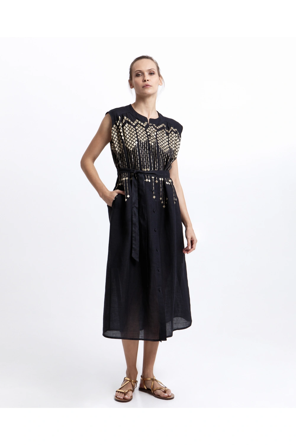 Ένα midi φόρεμα από ελαφρύ μαύρο linen με structured ώμους και κουμπιά στο μπροστινό μέρος που συνδυάζει minimalist γραμμή με εντυπωσιακό χρυσό geometric μοτίβο στο μπούστο. Το κέντημα ξεκινά πυκνό και μεγαλοπρεπές στην κορυφή και αραιώνει σταδιακά προς τη μέση σαν να στάζει χρυσός, δημιουργώντας ένα οπτικό αποτέλεσμα που αποπνέει αρχαϊκή μεγαλοπρέπεια. Η υφασμάτινη ζώνη ορίζει τη σιλουέτα με διακριτική χάρη, ολοκληρώνοντας ένα look που μιλά με αυτοπεποίθηση.