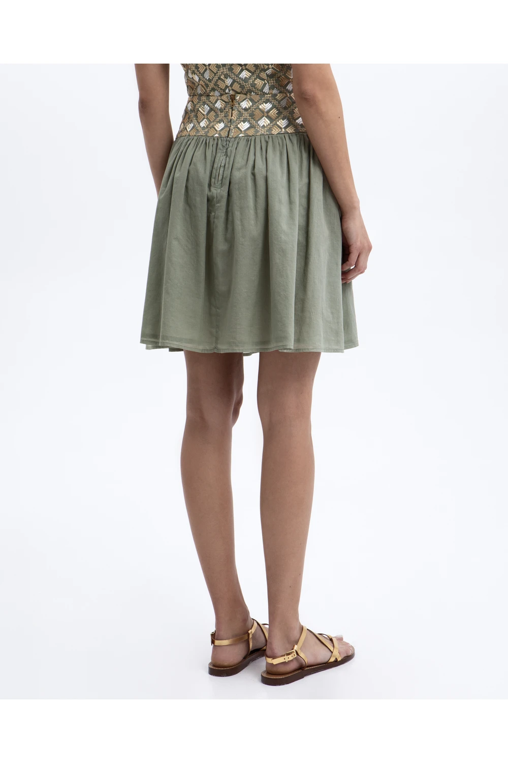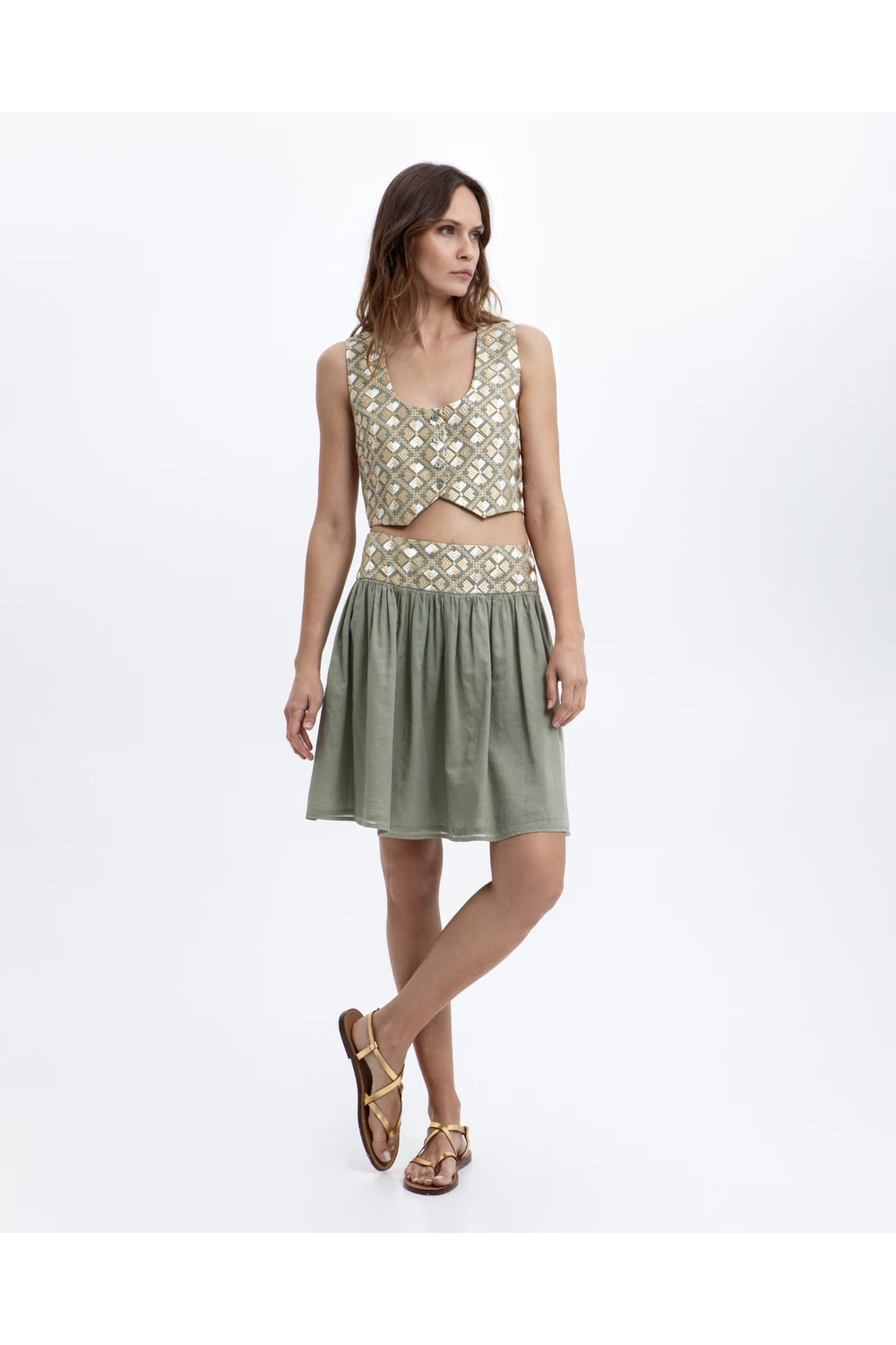 Αέρινη mini φούστα σε απαλό χακί με φαρδιά jacquard μέση σε χρυσό γεωμετρικό μοτίβο — ένας έξυπνος συνδυασμός υφής και κίνησης που ανεβάζει κάθε casual look σε νέο επίπεδο.