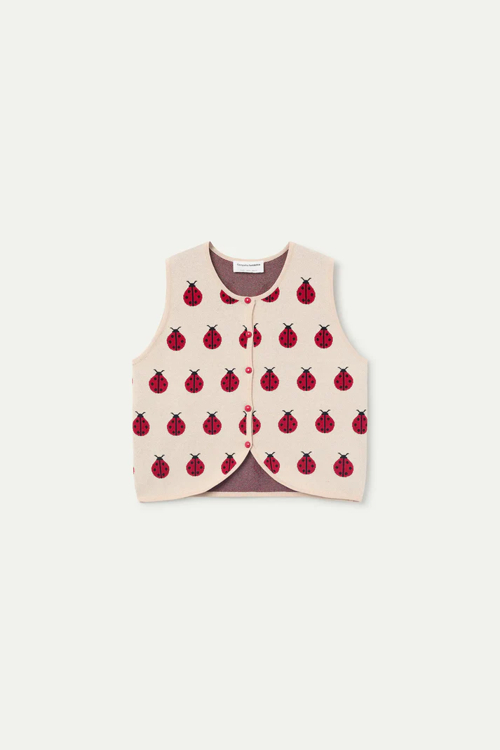 Πλεκτό τοπ με σχέδιο πασχαλίτσες. Στρογγυλή λαιμόκοψη και αμάνικο σχέδιο. Κλείσιμο μπροστά με κόκκινα κουμπιά. Το μοντέλο έχει ύψος 177 cm και φοράει μέγεθος S.