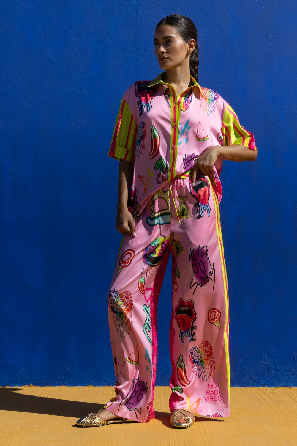 Φαρδύ παντελόνι με ψηλόμεση γραμμή και λάστιχο στη μέση με κορδόνι, σε ροζ βάση με all-over pop-art graffiti print. Διαθέτει χαρακτηριστικές νέον κίτρινες ρίγες στα πλαϊνά και τσέπες, ενώ το πίσω μέρος φέρει all-over graffiti τύπωμα σε έντονο φούξια φόντο. Ταιριάζει απόλυτα με το αντίστοιχο πουκάμισο της συλλογής για ένα statement σετ εμφάνισης.