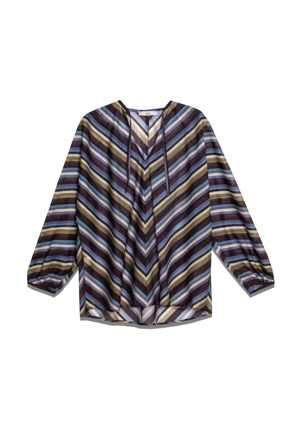 Αέρινη μπλούζα με ριγέ μοτίβο και κομψό V λαιμόκοψη με διακριτικό δέσιμο. Τα μακριά μανίκια με λάστιχο προσφέρουν άνεση και θηλυκή κίνηση. Ιδανική επιλογή για καθημερινά αλλά και πιο chic looks. Συνδυάζεται εύκολα με jeans ή tailored παντελόνια για μοντέρνο στυλ.