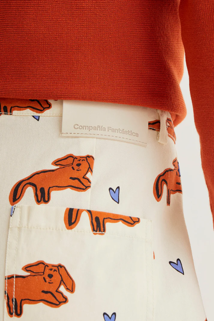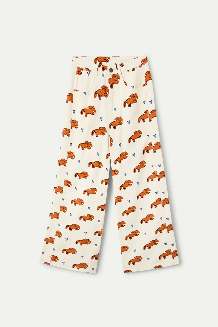 Παντελόνι από 100% βαμβάκι με τύπωμα Tochi. Σταθερή ψηλή μέση. Κλείσιμο με φερμουάρ και κουμπί μπροστά. Φαρδιά ίσια γραμμή. Πλαϊνές και πίσω τσέπες. Το μοντέλο έχει ύψος 177 cm και φοράει μέγεθος S.