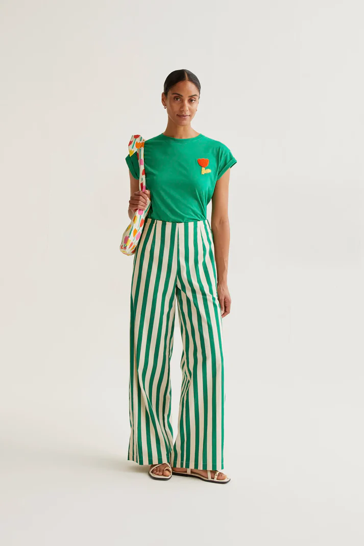 Πράσινο t-shirt από 100% βαμβάκι. Στρογγυλή λαιμόκοψη και κοντά μανίκια. Ελαφρώς πεσμένος ώμος. Κεντητή λεπτομέρεια κόκκινης τουλίπας. Το μοντέλο έχει ύψος 173 cm και φοράει μέγεθος S.