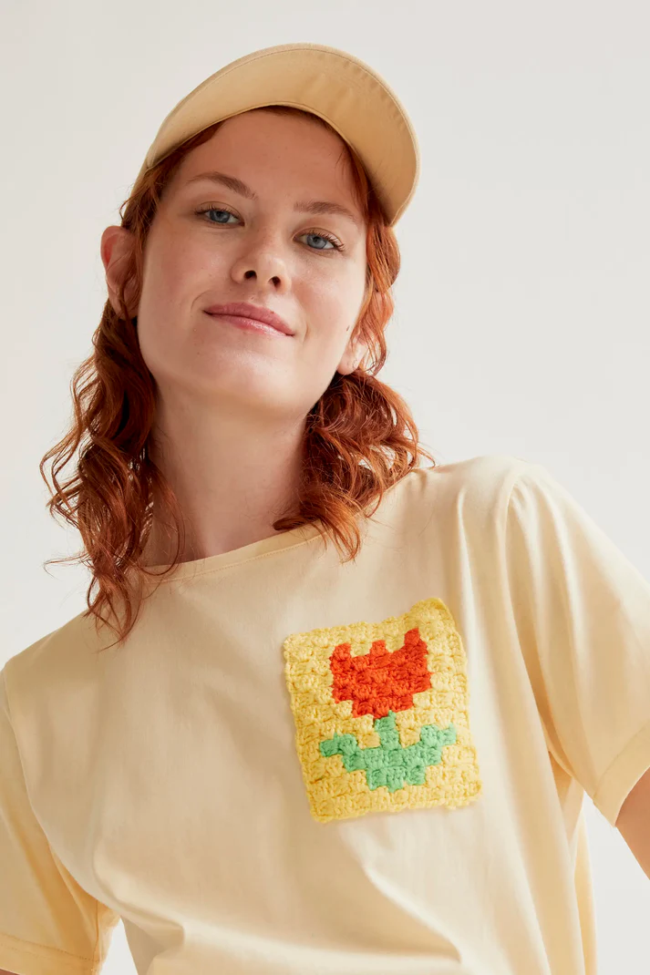 Ανοιχτό κίτρινο t-shirt από 100% βαμβάκι. Στρογγυλή λαιμόκοψη και κοντά μανίκια. Κεντητή λεπτομέρεια τουλίπας. Το μοντέλο έχει ύψος 175 cm και φοράει μέγεθος S.