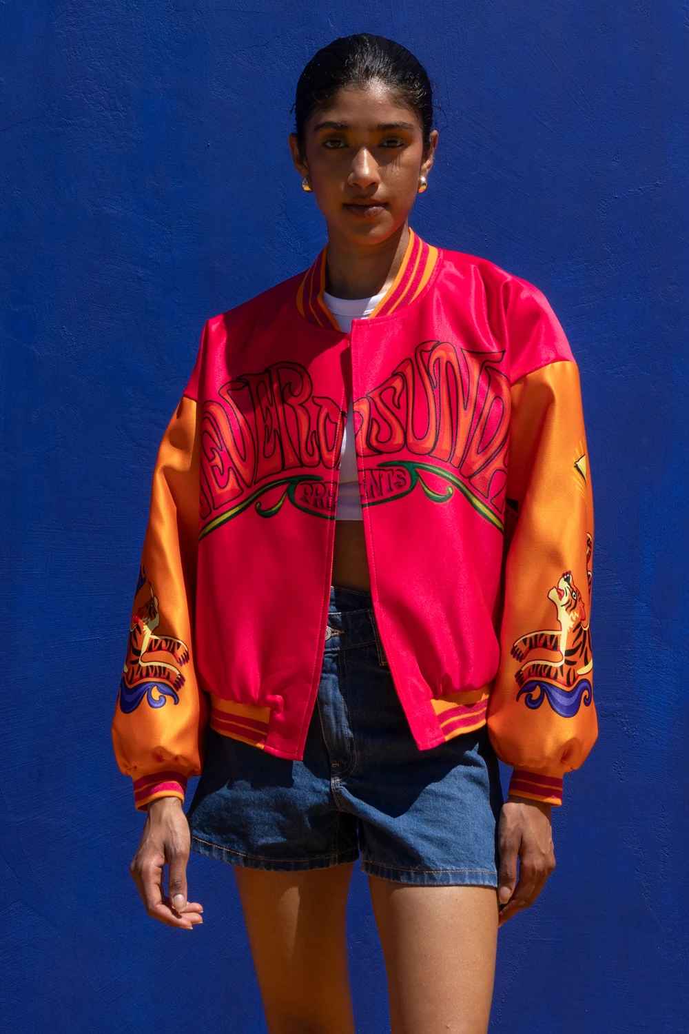 Statement bomber jacket Never on Sunday με έντονα χρώματα και retro-inspired graphic prints που αποπνέουν playful και δυναμική αισθητική. Η cropped γραμμή, τα rib τελειώματα και τα voluminous μανίκια δημιουργούν μία σύγχρονη σιλουέτα, ενώ τα καλλιτεχνικά σχέδια μπροστά και πίσω χαρίζουν μοναδικό χαρακτήρα και κάνουν το κομμάτι να ξεχωρίζει.